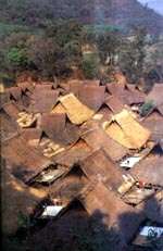 传统竹楼,全部用竹子和茅草筑成。竹楼为干栏式 建筑,以粗竹或木头为柱椿,分上下两层。下层四周无 遮栏,专用于饲养牲畜家禽,堆放柴禾和杂物。上层由 竖柱支撑,与地面距离约5 公尺左右。铺设竹板,极富 弹性。楼室四周围有竹篱,有的竹篱编成各种花纹并涂 上桐油。房顶呈四斜面形,用草排覆盖而成。一道竹篱 将上层分成两半,内间是家人就寝的卧室,卧室是严禁 外人入内的。外间较宽敞,设堂屋和火塘,既是接待客 人的场所,又是生火煮饭取暖的伙房。楼室门外有一走 廊,一侧搭着登楼木梯,一侧搭着露天阳台,摆放着装 水的坛罐器皿。