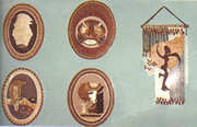 牛角工艺品 呼伦贝尔盟民族木制品研究所开发的牛角雕共分壁饰、摆饰、服饰三大类,人物、动物、杯 瓶、图腾、项链、戒指、耳环、发卡、腰带、书法十个系列,一百余个品种。