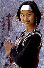 女子服饰 妇女的服装一般是上着衣,下穿裙子。她们的裙子独具特色,是用一幅布围起来的裙子,她们留长发,不梳辫子,戴银箍或竹制的发圈,将头发拢在后面。耳朵上戴有银制大耳环,颈脖上戴数个银项圈和若干串料珠,腰间戴有若干竹圈,有的用黑漆漆过。有的上刻花纹, 大小臂及手腕上均带有一个或两个银镯;手上戴戒指;小腿上端戴有若干用竹藤做的细圈,未成年女子每增一岁,脚上增一细圈,因此有“欲问年龄数脚圈”的说法。